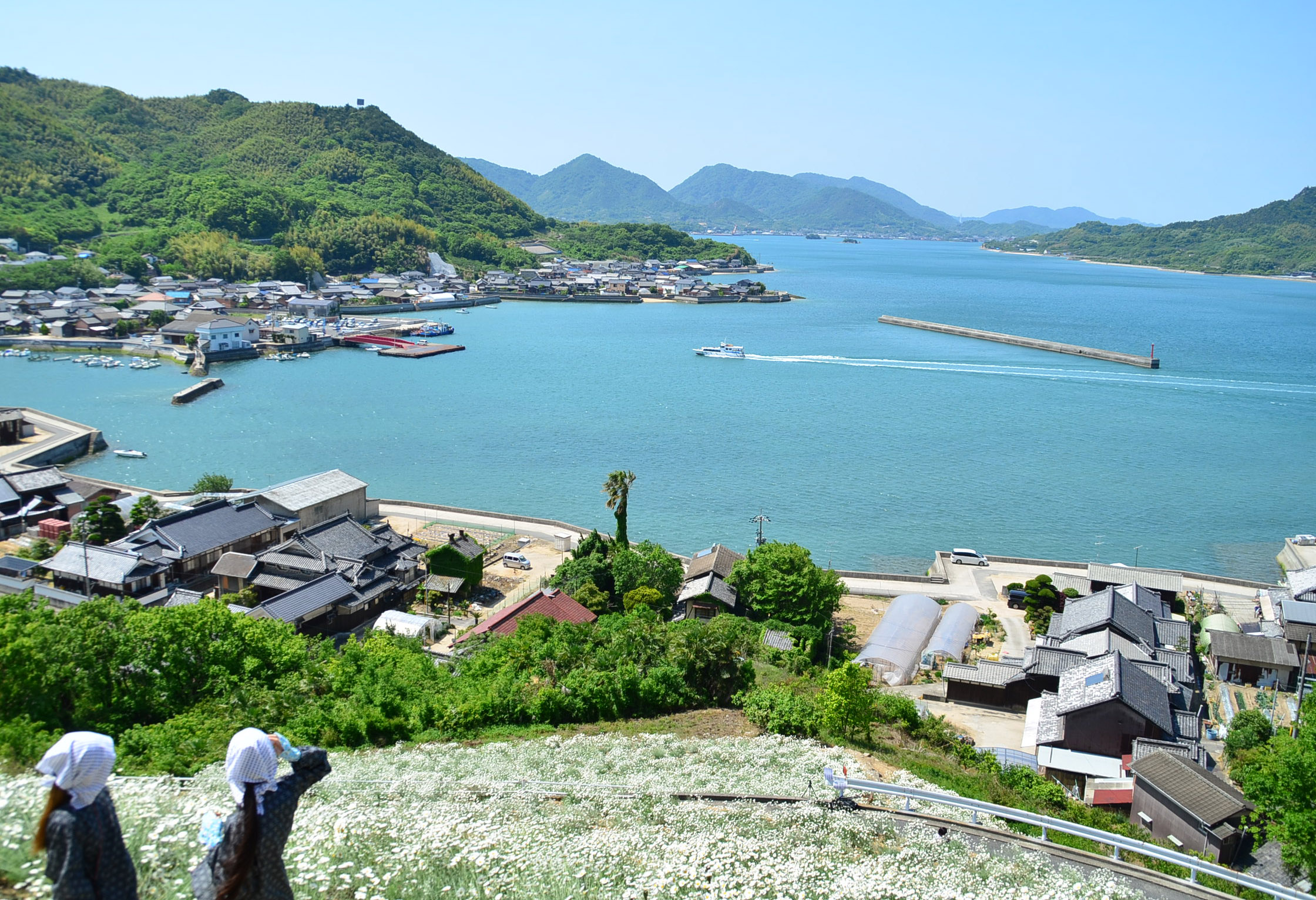 (眼下に重井西港が広がる除虫菊畑。昔ながらの石積みの残る段々畑一面に咲く除虫菊は大変美しく、多くの愛好家が訪れます。)