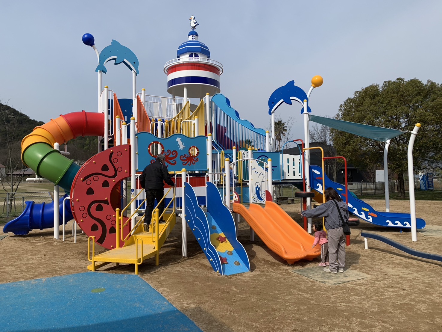 因島アメニティ公園は、市民及び来訪者の憩いの広場です。園地内には、風通しがよい木造の交流棟や子ども向けの遊具があります。また、広い園地では、のびのびと走りまわって遊べます。