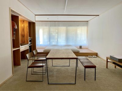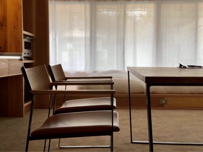 1階がオフィス&レセプション、2階が宿泊スペースとなっており、漆喰と無垢材のみで仕上げたシンプルな空間です。